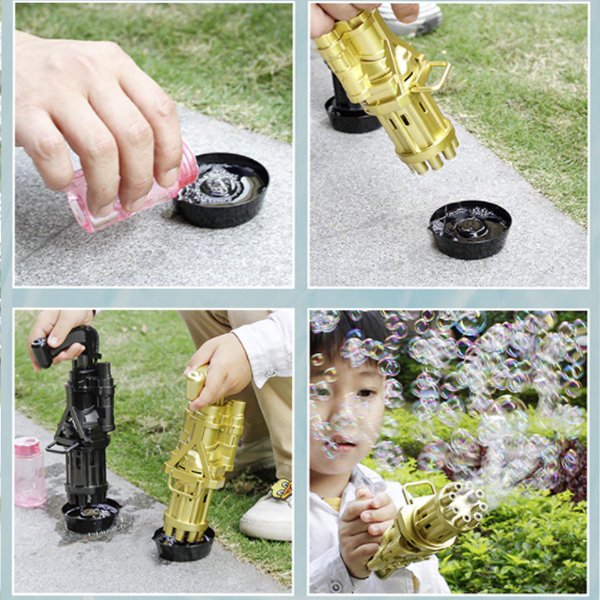 Velmi snadné použití, stačí vložit baterie, doplnit bublinkovou kapalinu, stisknout spoušť a bavit se střílením bublin