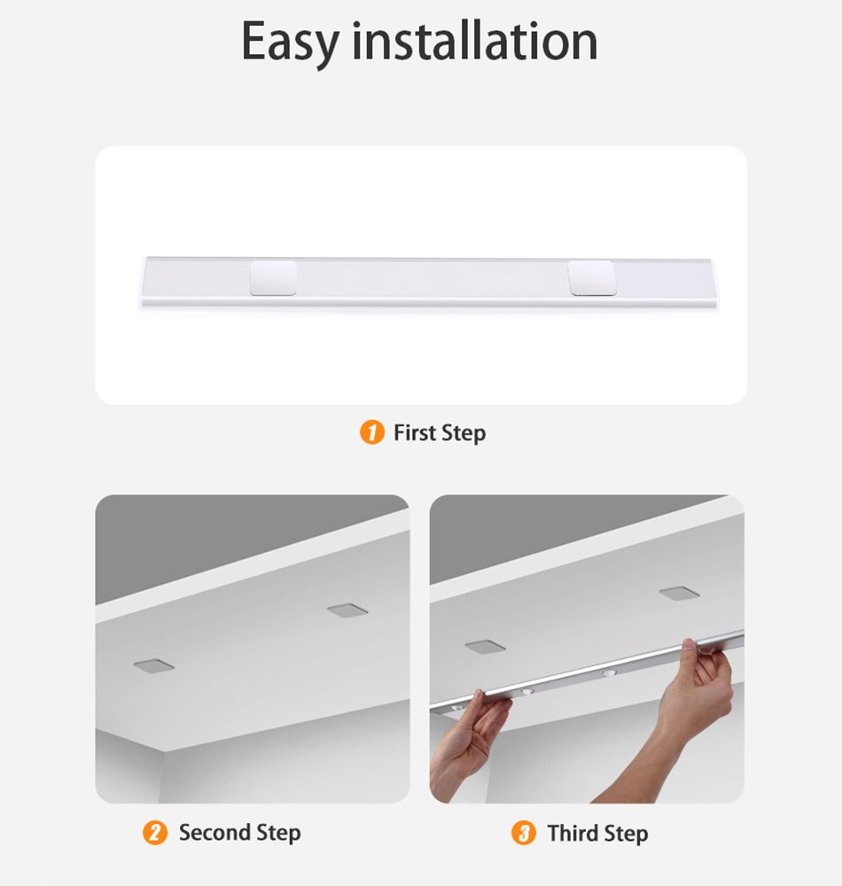 Světlo se senzorem je tenké a nenápadné, ať už ho připevníte kamkoli. Instalace je jednoduchá, protože nevyžaduje žádné vrtání. V balení obdržíte dvě magnetické železné samolepky, přiložte je na požadované místo, odlepte ochrannou pásku a nalepte na ně svítidlo. Světlo LED tak bude vždy pevně připevněno.
