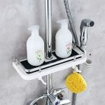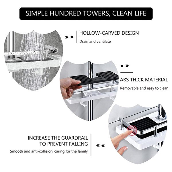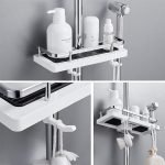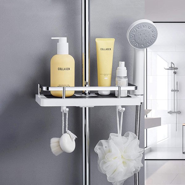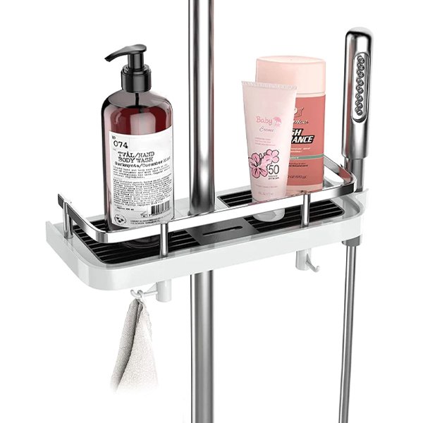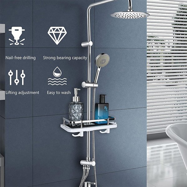 S více nastavitelnými poličkami a háčky nabízí Showy dostatek úložného prostoru, abyste udržovali vaše sprchové produkty snadno dosažitelné. Zapomeňte na zvedání šampónu ze země!