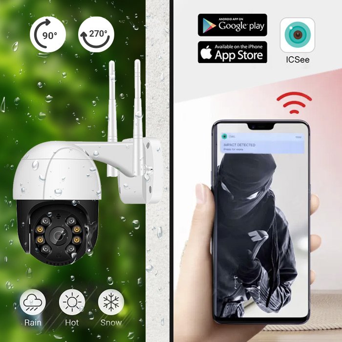 Ochranné pouzdro s krytím IP66 zajišťuje, že fotoaparát funguje i v extrémních povětrnostních podmínkách, takže bude efektivně pracovat i v těch nejnáročnějších podmínkách. Kamera se může otáčet o 270 stupňů vlevo a vpravo a o 90 stupňů vertikálně, což jí umožňuje snímat každý kout kolem vašeho domu.